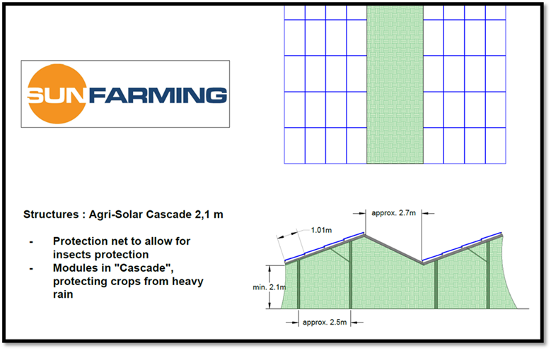 The previous illustration shows the selected system. After examining the climatic conditions and agricultural requirements for the region, it was decided to install a single type of structure (Agri-Solar) with modules in a cascade arrangement (protecting plants from heavy rainfall), whereby the system can be closed with protective nets, turning it into a real greenhouse.